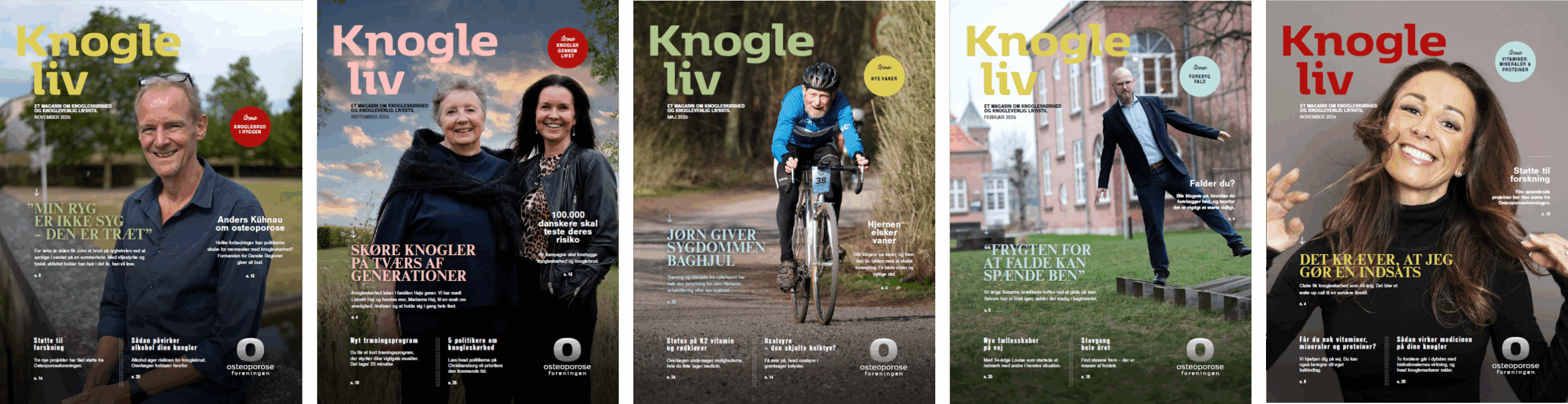 Knogleliv er Osteoporoseforeningens medlemsmagasin – et inspirerende og oplysende magasin, der udkommer fire gange om året. Her kan du læse om den nyeste viden inden for forebyggelse, behandling og livet med knogleskørhed. Vi tager hele tiden nye temaer op i magasinet.