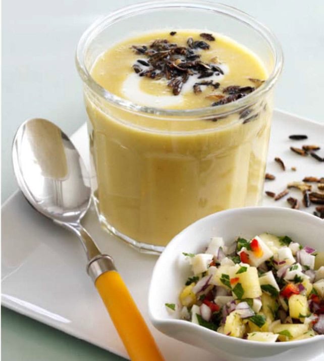 Server karrysuppen med ananassalsa og poppede vilde ris til.