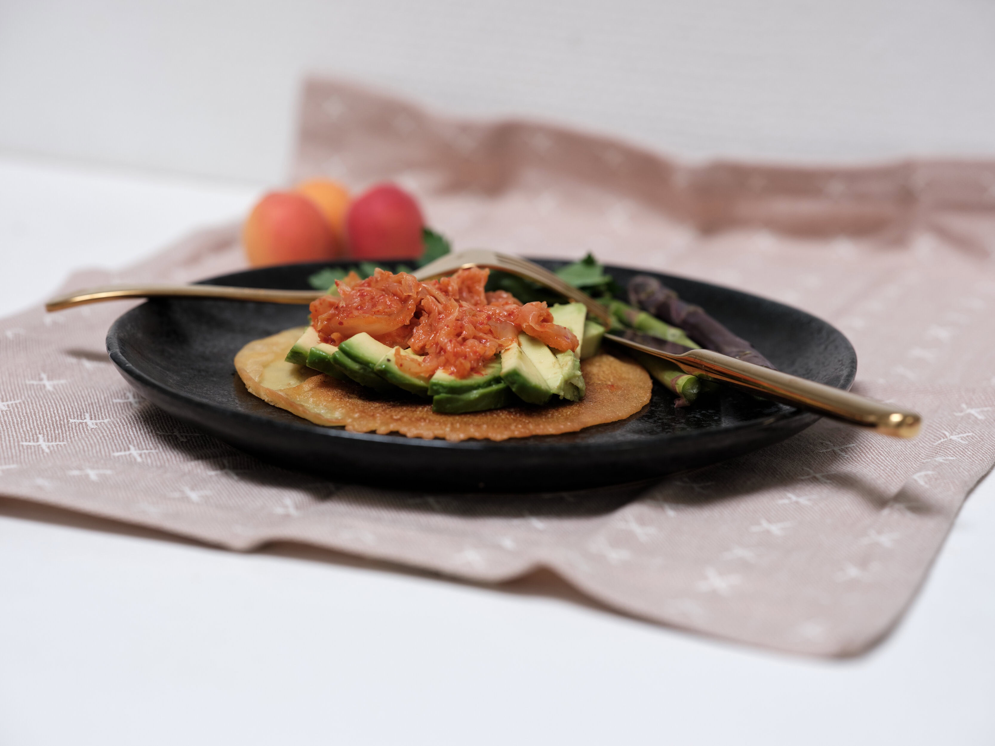 Læg skiver af avocado på pandekagen og top med kimchi.