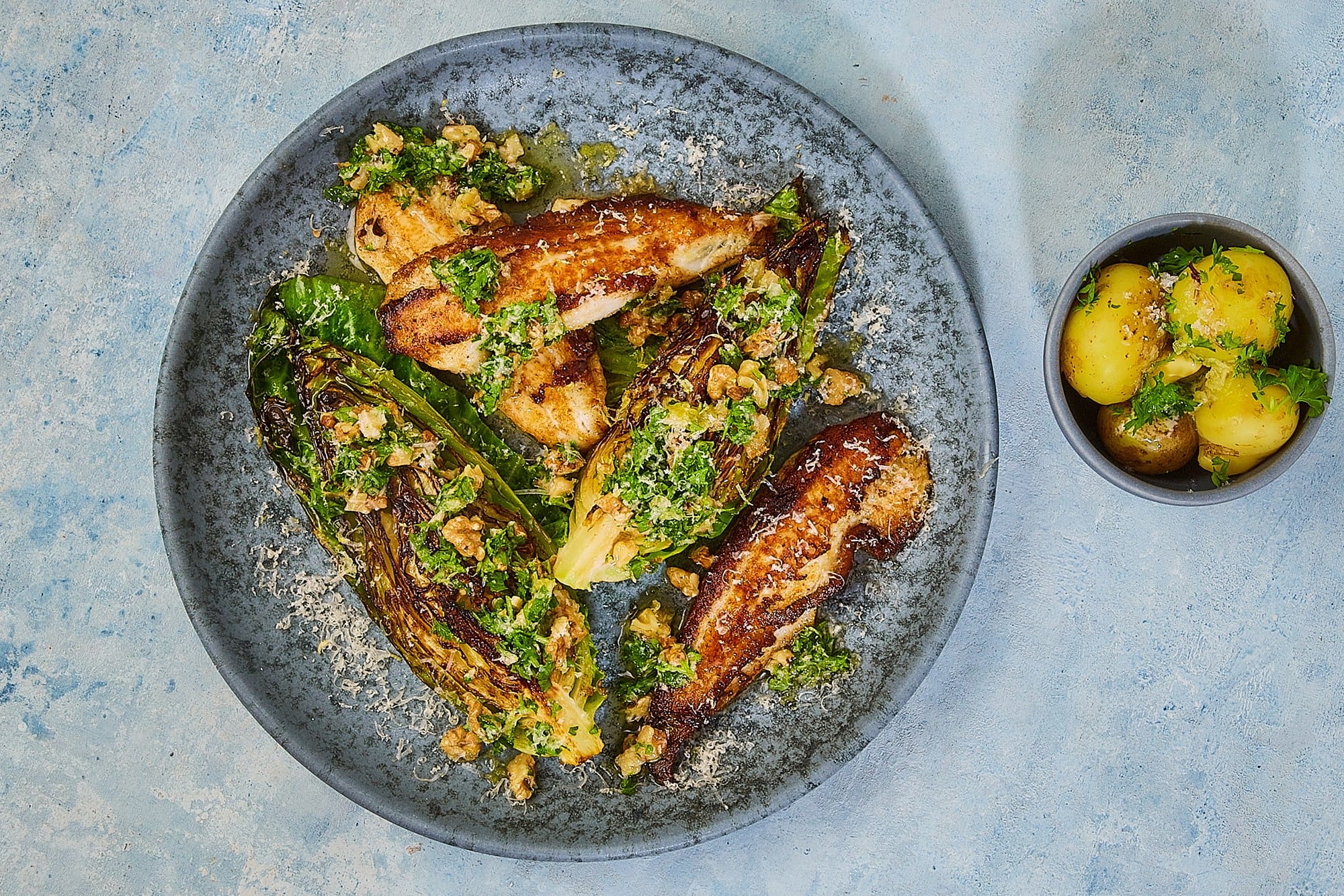 Fordel parmesan-, valnødde-, og ansjossmør over, og lad det lækre smør smelte ned gennem bladene.