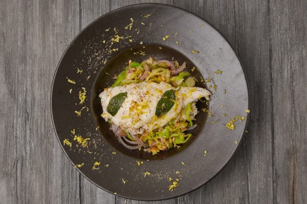 Kom det sidste hakkede hvidløg på panden sammen med plukkede og grofthakkede salvieblade (gem lidt til fisken) og vend det med den stegte kål.